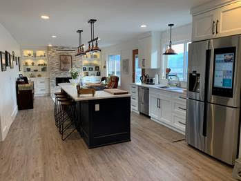 This client renovated the entire main floor of their home to create a gourmet chef’s kitchen and open plan layout that included a cozy, functional family room, relocated / replaced old living room fireplace / mantel, with a 3-sided gas fireplace between living room and dining room, making it visible from several rooms; and incorporated many family heirloom art and furniture pieces. Their view of the beautiful Sumas Prairie that had been blocked by a door and wall was opened up by installing a large picture window, making the view visible from the front door, living room and kitchen. Continuous flooring throughout the space provides visual continuity throughout making the space appear even larger.